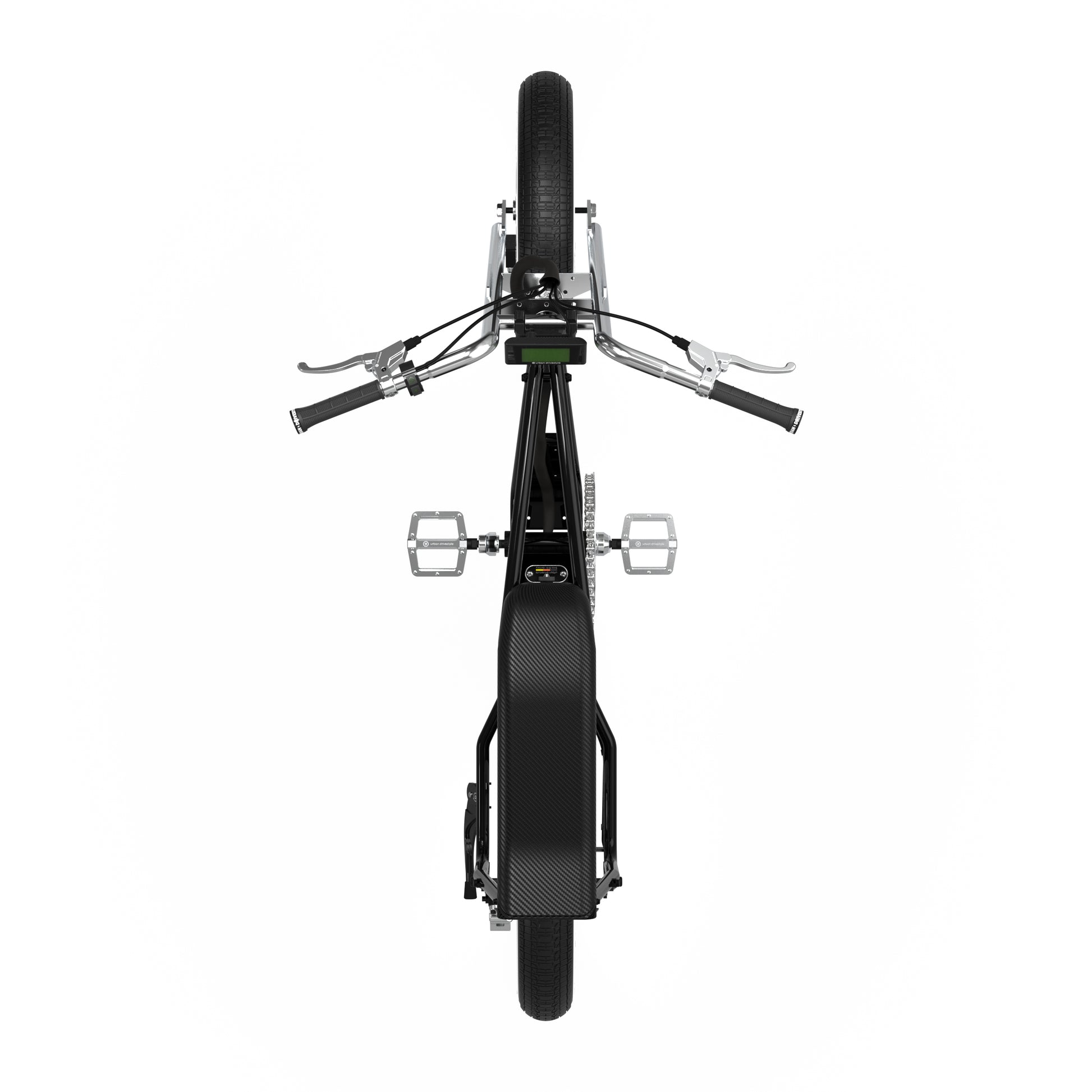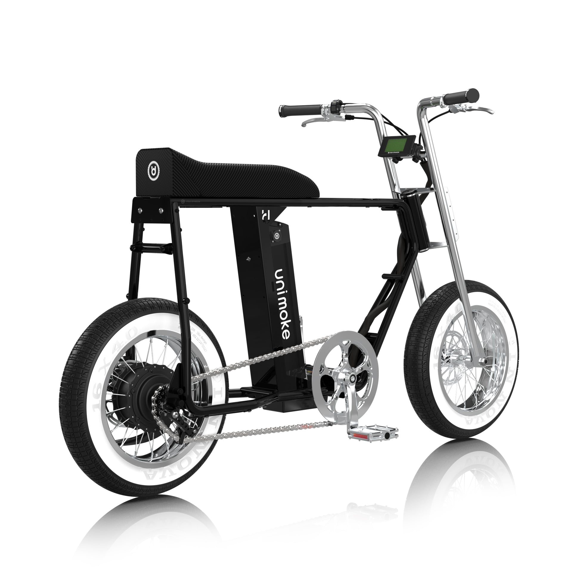 Unimoke minibike 珍珠黑承襲 Urban Drivestyle 經典設計,以 1960 年代迷你摩托為靈感,結合 16 吋小輪徑與 4.0 胖胎,帶來靈活又穩定的騎行體驗。Panasonic 48V 電池搭配高扭矩後輪電機與 9 段助力,提供強勁動能。這款迷你胖胎電動腳踏車,將復古外型與現代性能完美融合,為都市騎士帶來全新風格。